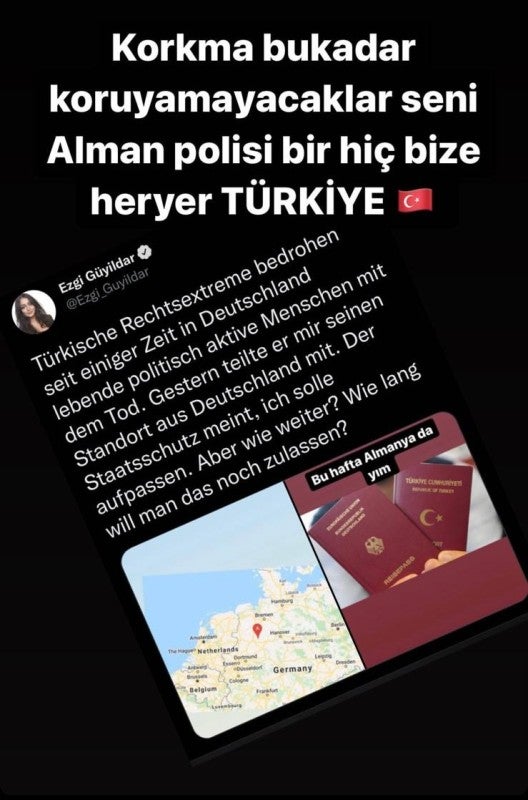 Bir tehdit mesajında, “Korkma bu kadar. Koruyamayacaklar seni. Alman polis bir hiç. Bize her yer Türkiye” ifadesi yer alıyor. Başka bir mesajda ise “Bu hafta Almanya'dayım” deniliyor.