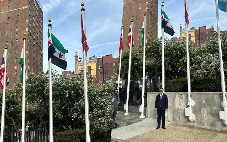 Suriye Dışişleri Bakanı Esad Hasan Şeybani, ülkenin yeni bayrağını, New York'ta Birleşmiş Milletler binasının önünde göndere çekti