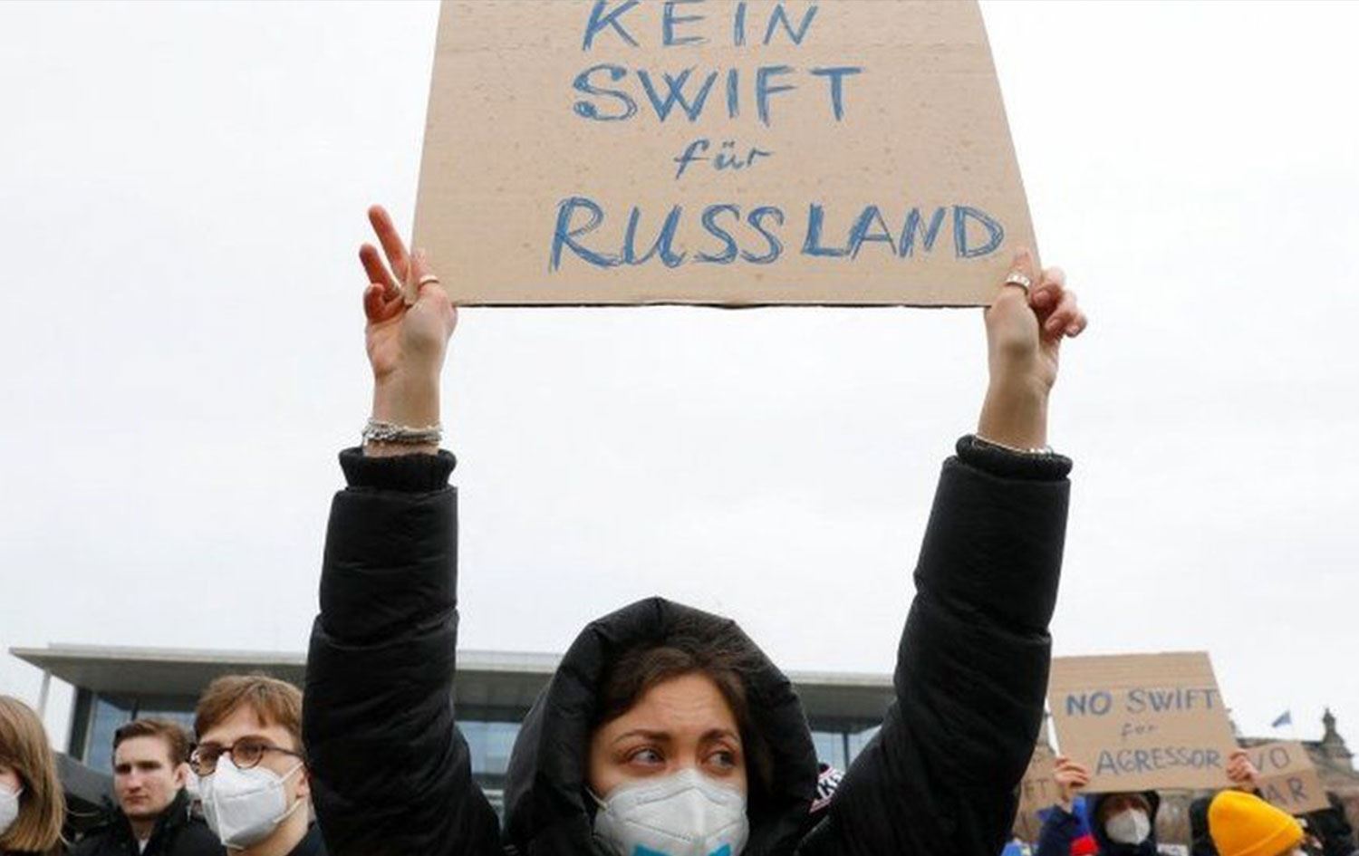 Gösteri düzenleyen savaş karşıtları Rusya'nın SWİFT sisteminden çıkarılmasını istiyor. Foto: BBC
