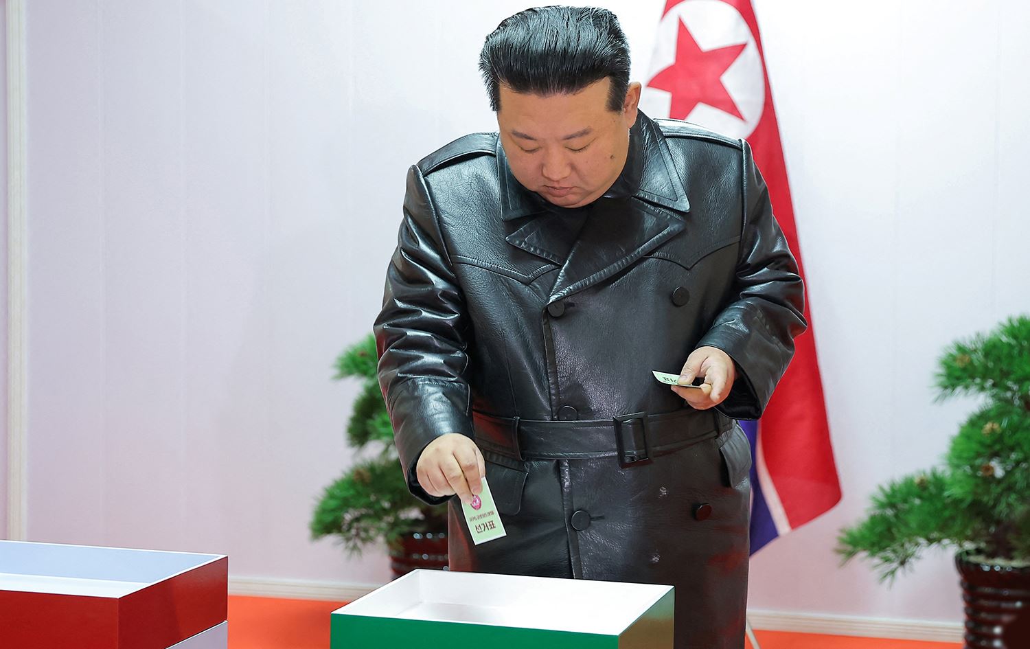 Devlet medyası yayınlanan bir fotoğrafta Kim Jong Un, biri onay için yeşil, diğeri muhalefet için kırmızı renkte iki kutunun önünde durarak oy kullanırken görüldü.