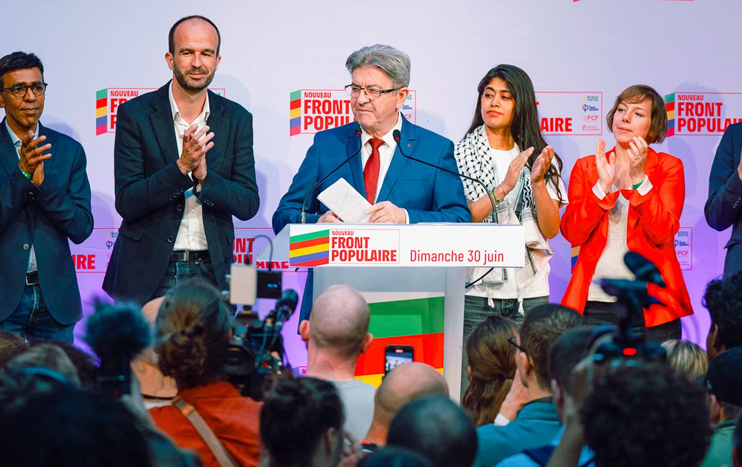Yeni Halk Cephesi lideri Jean-Luc Mélenchon da üçlü bir eşitlik durumunda Yeni Halk Cephesi'nin ikinci turda, üçüncü sıradaki tüm adaylarının Ulusal Birlik adayı aleyhine çekilmesi ve seçmenlerini Le Pen'in partisinin adayının karşısındaki adaya oy vermeye çağırdı. Ipsos'un sandık çıkış anketlerine göre 577 seçim bölgesininin yüzünden çoğunda sol ittifak adayı üçüncü sırada görünüyor.