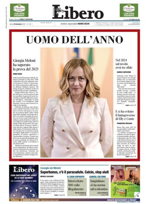 2024 yılına girmeye bir gün kala her ülkede yılın ‘en’leri seçiliyor. İtalya'nın ilk kadın Başbakanı Giorgia Meloni, aşırı sağcı Libero Quotidiano gazetesi tarafından "Yılın Erkeği" seçildi.
