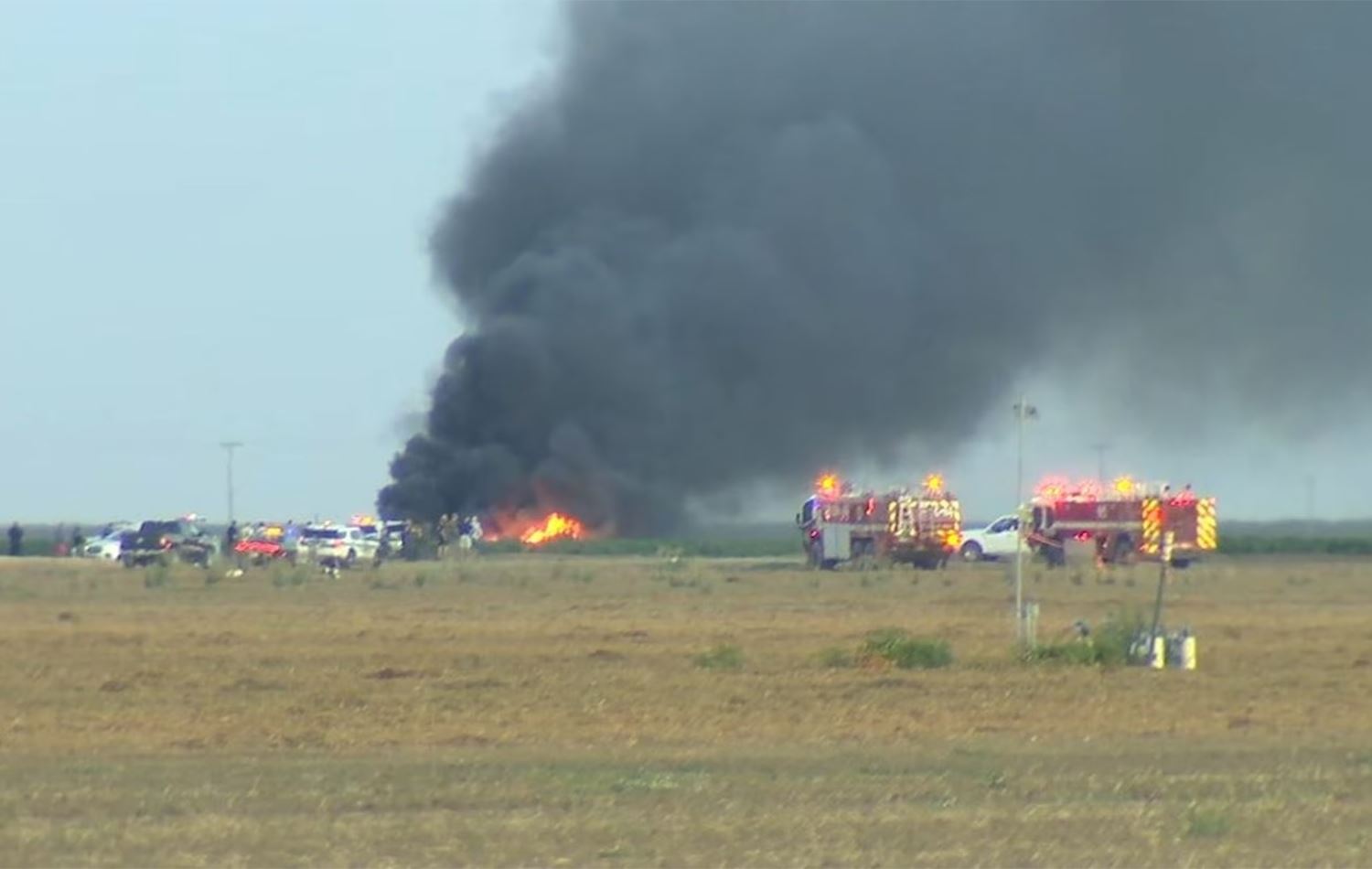 Olay yeri görüntülerinde, uçağın düştüğü açık alanda alev ve yoğun dumanın yayıldığı görüldü.